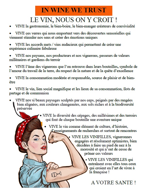 Vinifilles n.f. pl. : créatures de sexe féminin engagées dans la viticulture en Occitanie, fédérées en 2009, adeptes du plaisir et de la richesse de leur métiers, belles, rebelles, actives, gourmandes, sympas, sociables et dynamiques !